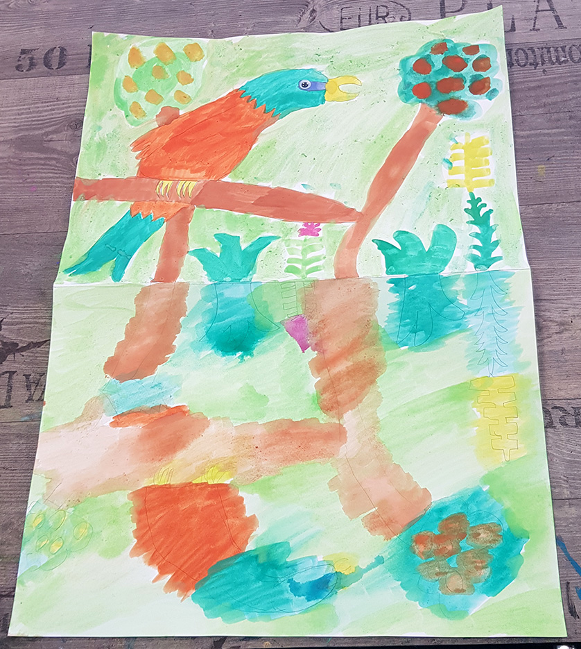 In zwei Stunden malen wir gemeinsam einen bunten Papagei, der sich im Wasser spiegelt. Dabei lernen die Kinder spielerisch das Prinzip der Spiegelung kennen, was ihnen hilft, ein erstes Verständnis für räumliches Denken und die richtige Darstellung von Formen und Proportionen zu entwickeln.